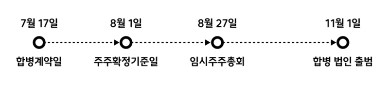 합병은 주주총회의 승인을 받아야 하며, 8월 27일에 개최 예정인 임시 주주총회에 안건으로 상정될 예정입니다. 합병이 통과되려면 전체 주식 수의 1/3 이상이 찬성해야 하며, 참석 주식 수의 2/3 이상이 찬성해야 합니다. 주주총회의 승인을 받게 되면 최종적으로 11월 1일에 합병 법인이 출범하게 됩니다.